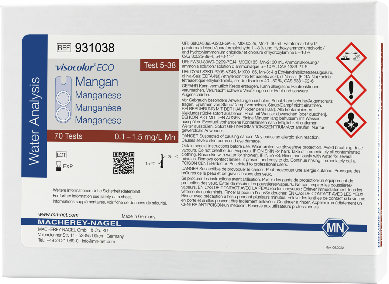 Kit de ensayo colorimétrico para la determinación de Manganeso en muestras de agua. VISOCOLOR ECO Manganeso combina un fácil desempeño con una alta seguridad de medición, por compensación de color y turbidez. Para la determinación visual por comparación con una tabla de colores o medición fotométrica con nuestros fotómetros compactos.