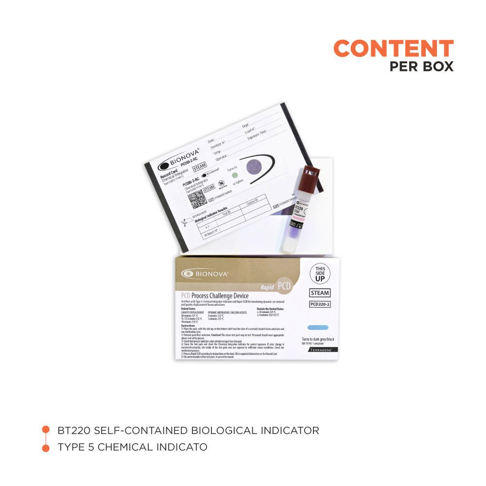 Detecta la eliminación inadecuada de aire y la penetración de vapor en autoclaves de vapor de extracción dinámica de aire (pre-vacío) y de desplazamiento por gravedad entre 121-135 ° C.