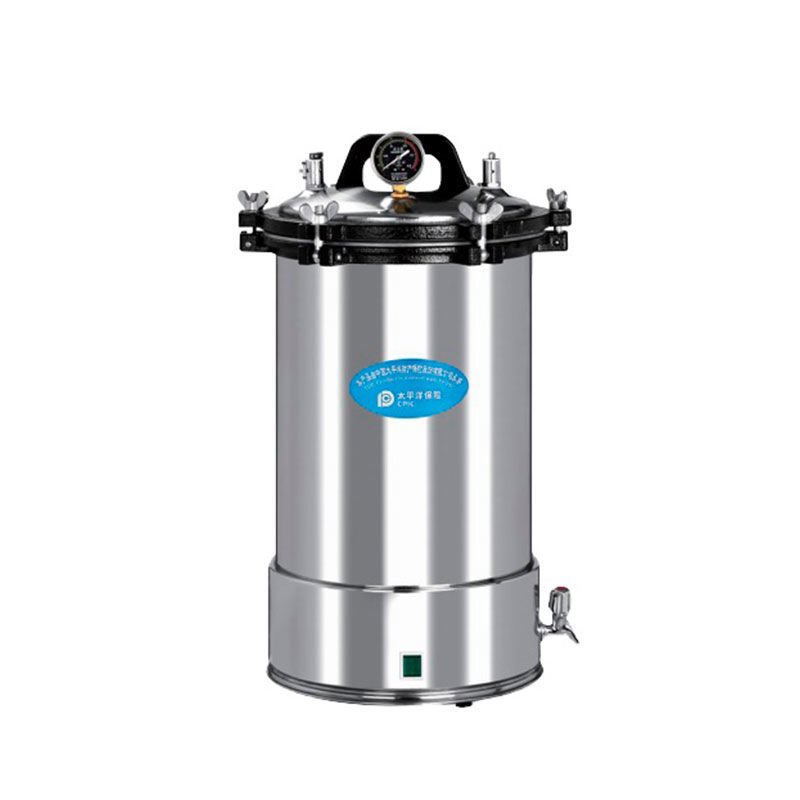 Autoclave YX-18LD Portátil Eléctrica, Acero Inox., Desagote, Volumen 18L. Se puede utilizar en hospitales, centros de salud pública, clínicas, fábricas, institutos de investigación científica, etc., para esterilizar equipos médicos, utensilios de vidrio, soluciones, sustratos. Estructura completamente de acero inoxidable. Indicador de presión de doble escala. Con canilla de desagote. Calefacción con electricidad. Fácil de operar, seguro y confiable.